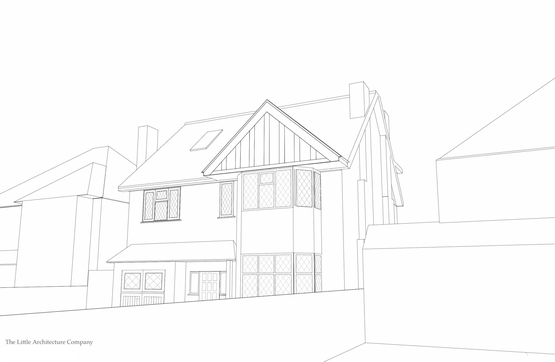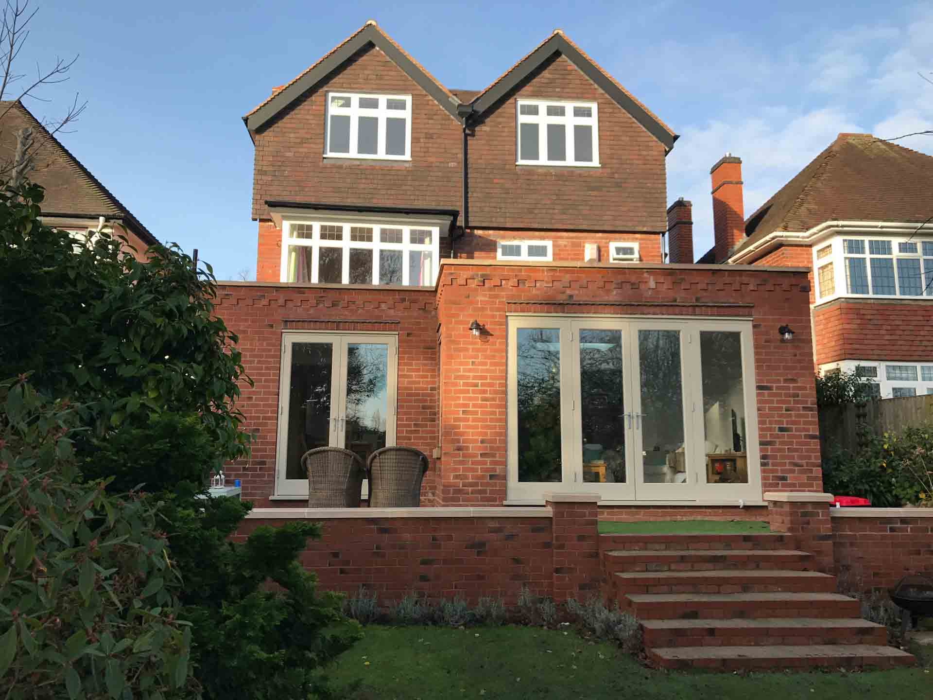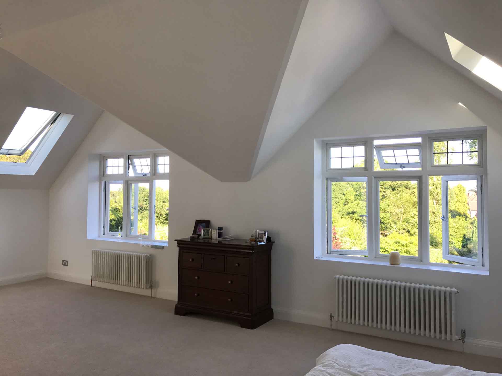A sensitive hip to gable roof conversion with dormer windows overlooking the garden allowed the creation of a generous master bedroom suite with vaulted ceiling, shower room, study and eaves storage.