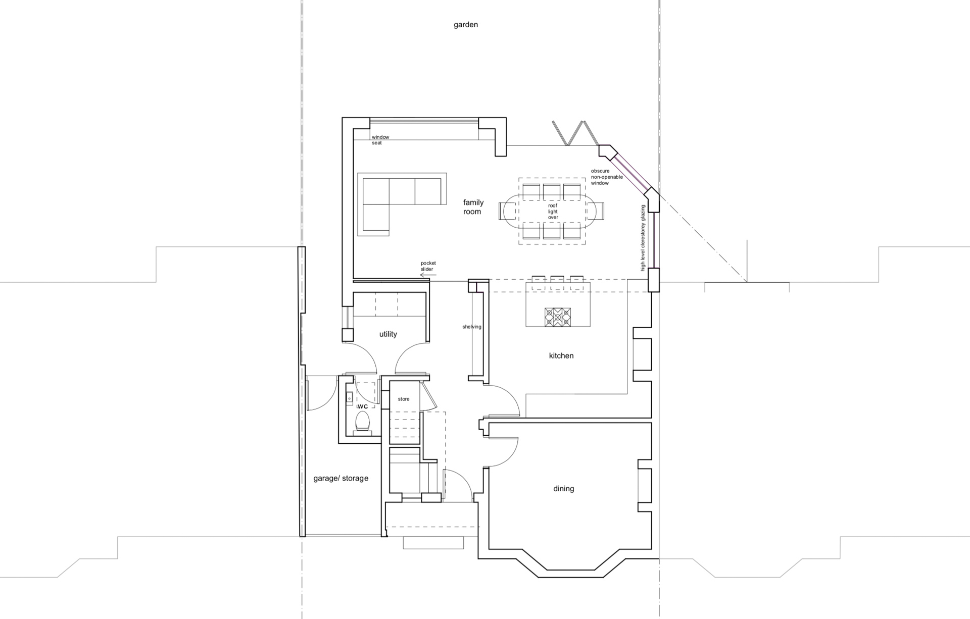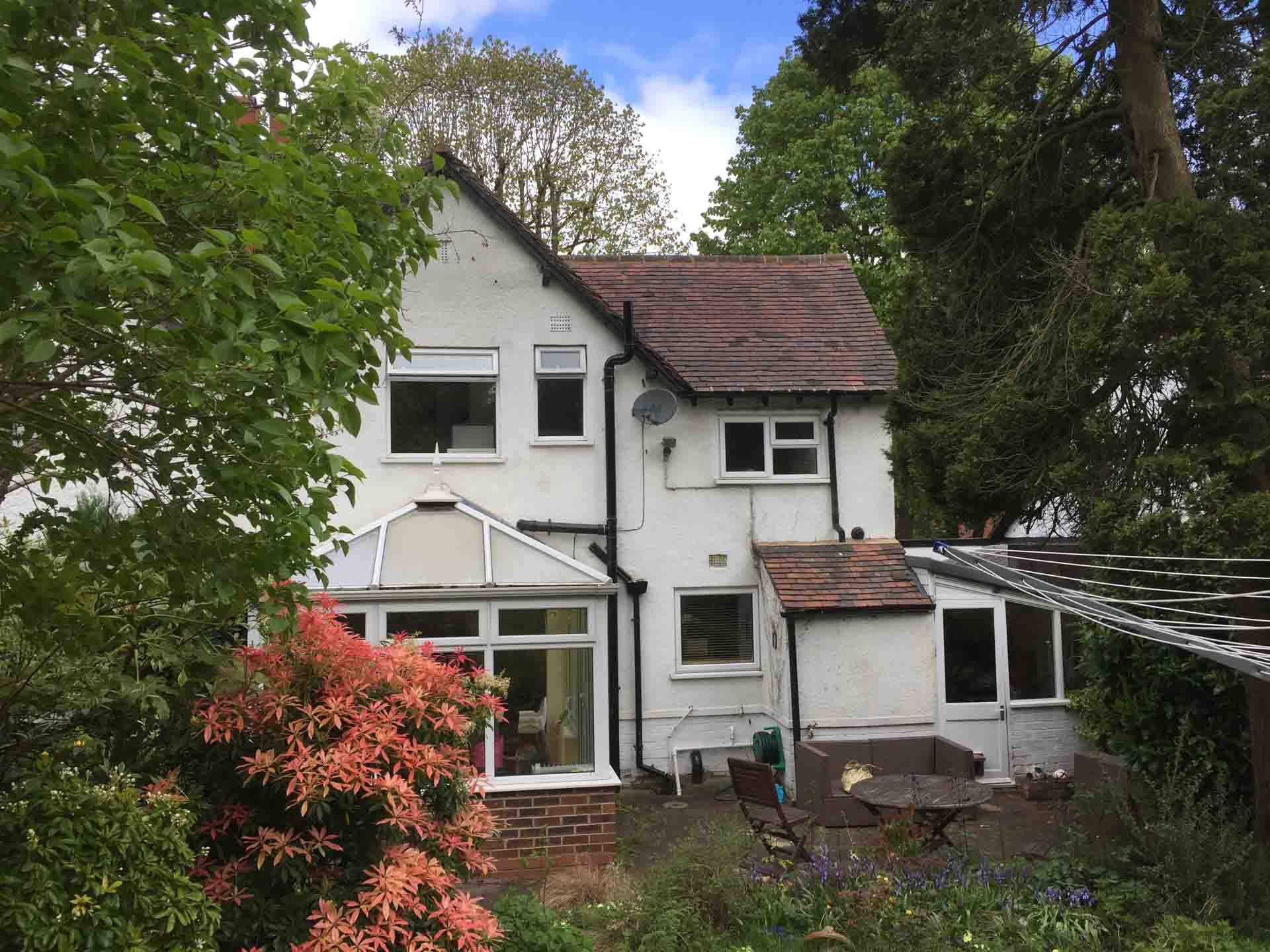An Arts and Crafts semi-detached house located in a leafy Birmingham suburb. At ground floor we designed a large top-lit kitchen/family room with a window seat and fully retractable doors leading into the mature gardens. The first floor benefits from a large additional master bedroom with vaulted ceilings and a new family bathroom.
