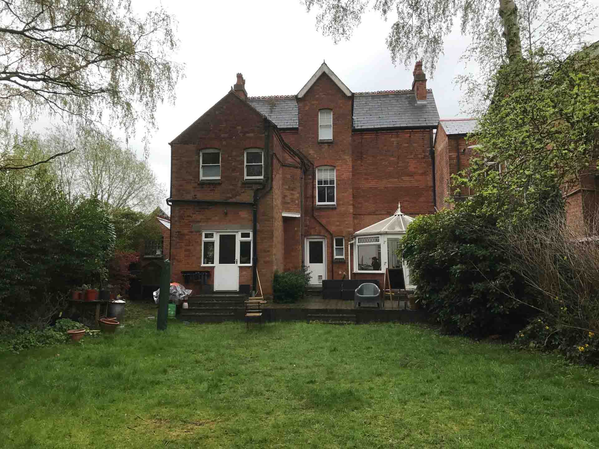 We were approached to design a new single storey garden-family room to replace an ageing conservatory, and link into the existing kitchen of a Victorian detached residence in Kings Heath. The design incorporates a striking monopitch roof and canopy above large format sliding doors set at an angle to the house to best appreciate the extensive gardens. Brass cladding to the return cheek of the structure was chosen to contrast with the applied charcoal render of the existing projecting gable.