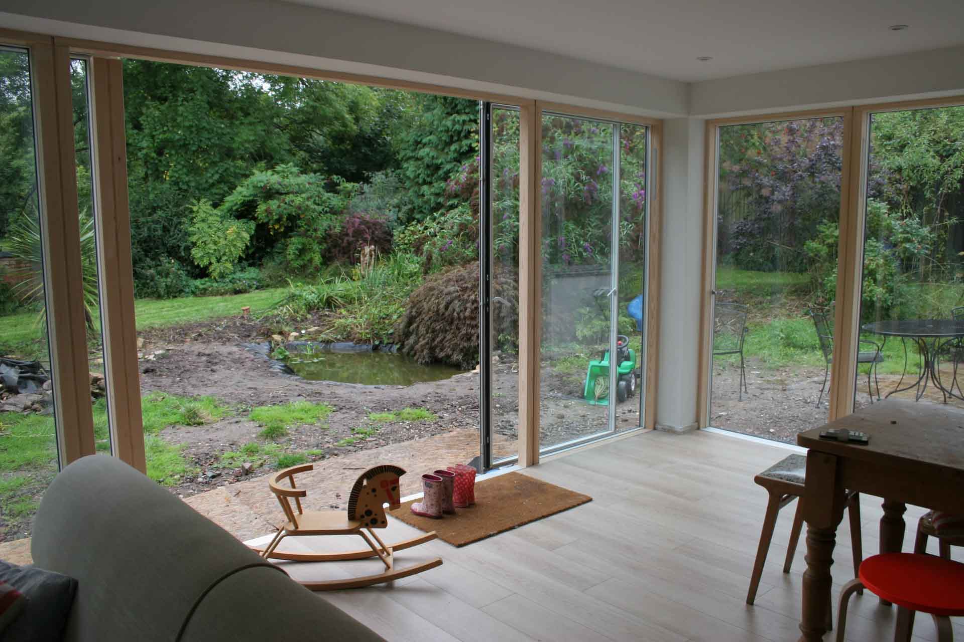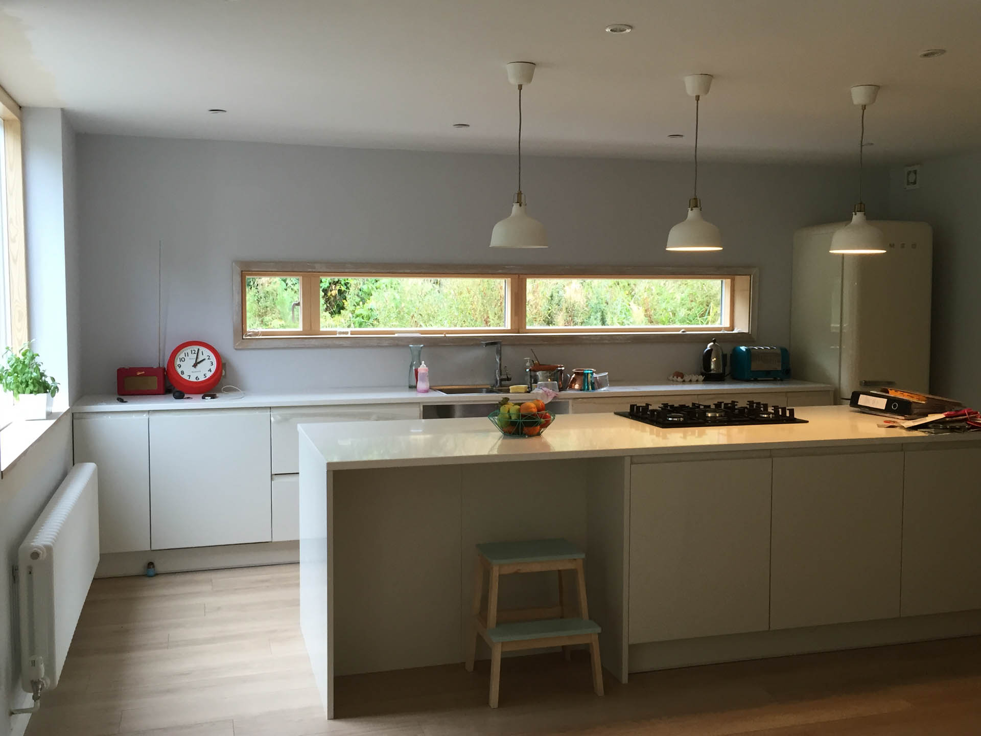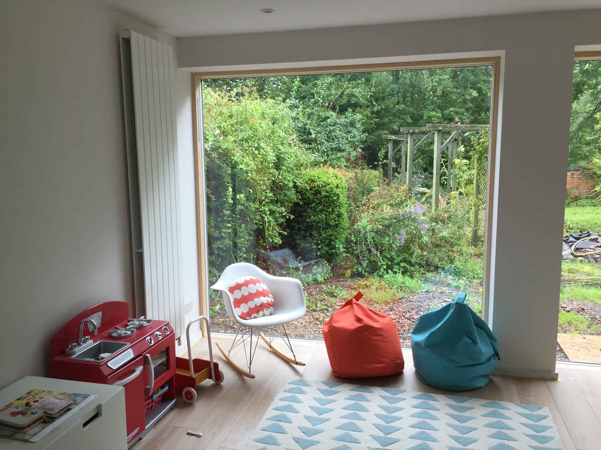 A 1970’s house set at the end of a quiet cul-de-sac with boundaries onto the Chiltern Railway Line and a delightful nature reserve. At ground floor we provided a generous family kitchen-family room with large format sliding doors and picture window linking the space to the garden, and linear windows framing views onto the vegetable patch adjacent to the railway.